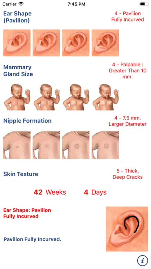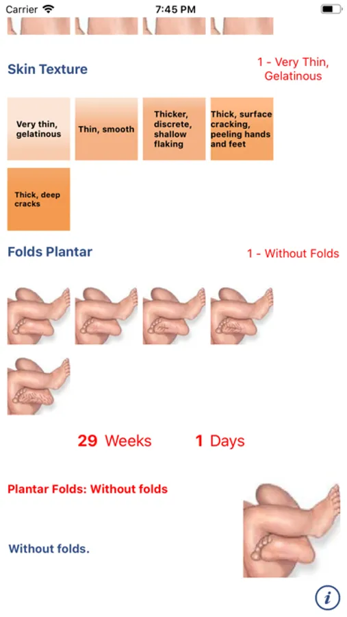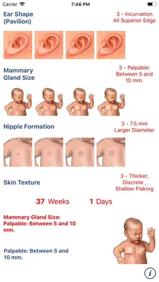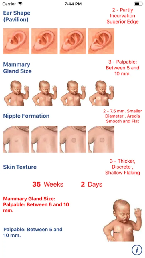 The App Neonatology: Capurro test allows you to estimate the gestational age of a newborn. The test considers the development of five different physiological parameters and combined scores give the desired estimate