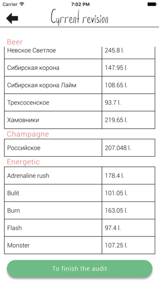 Mobile application REVIZOR has a simple interface that will be understandable to anyone. You can forget about bar lines and measuring cups. Just install in your gadget app REVIZOR. You can take it as not open, and open the bottle. As well as juices, soft drinks and beer. Then all measurements are formed in a convenient spreadsheet in a couple of clicks you can send to your accountant or a Manager.