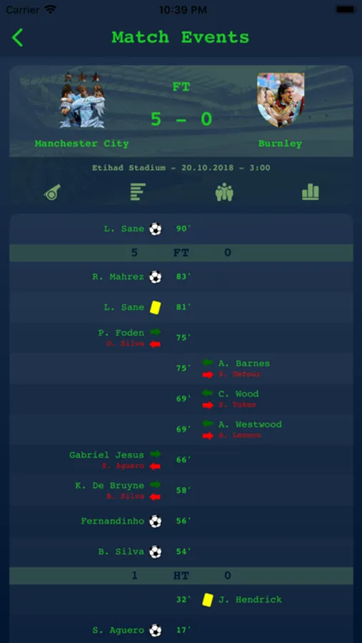 • Events match, with goals, own goals, assists, red and yellow cards and substitutions.