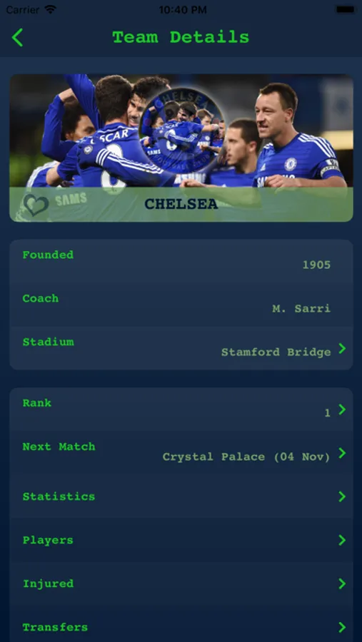 • Club details, ranking, next match, statistics, players, injuries and transfers.