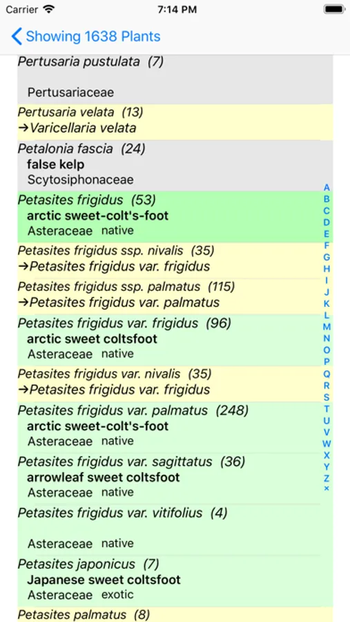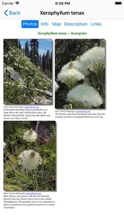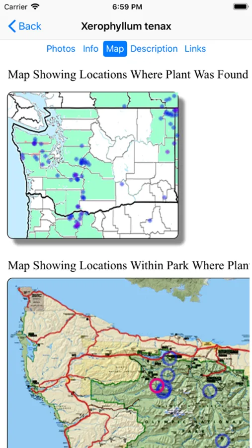 The App includes 1,783 species of plants found in the Olympic National Park. Overall, 817 are "Wildflowers", 126 are shrubs, 44 are broadleaf trees, 17 are conifers, 12 are vines, 219 are grass-like, 55 are fern-like, 245 are moss-like, 92 are seaweed and 208 are lichen.