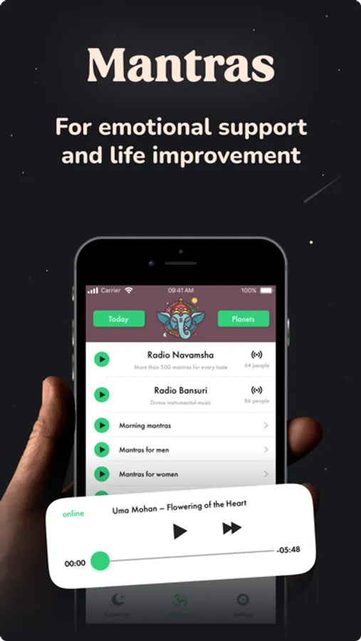 - Mantras to planets and Vedic deities (Shiva, Krishna, Lakshmi, Ganesha, Buddha, etc.) Playlists for each day of week.