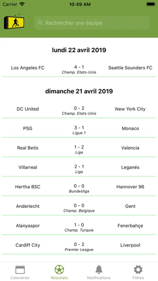 - filtrer par équipe pour n'afficher que votre équipe favorite ;