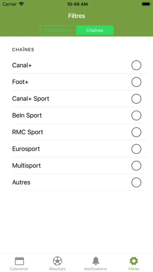 Les chaines françaises et internationales sont disponibles de cette application programme TV football : Canal +, Canal+ Sport, Canal+ Sport 360, Canal+ Foot, Amazon Pass Ligue 1, RMC Sport, Bein Sport 1, TF1, M6, Eurosport 1 et 2, OM TV, OL TV, W9, etc.