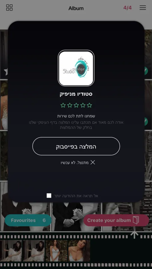 That’s where the fun really begins. With סטודיו מניפיק, your clients can view and proof their photos and albums from their mobile, tablet or desktop, whenever they like. Their privacy is protected with a personalized login, but if they decide to share their photos and albums with friends and family they can do so easily via social media. As a bonus for you, each time they do, your name and logo appears so there’s no doubt about who’s creative genius is behind the images! Comments left on images are automatically published on your Facebook page, generating a bank of positive feedback without you having to do a thing!