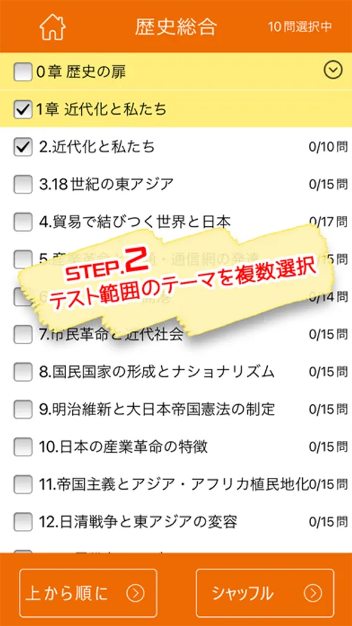 - 最初は書籍の掲載順,次は難易度を上げたシャッフルで,直前まで学習ができます。