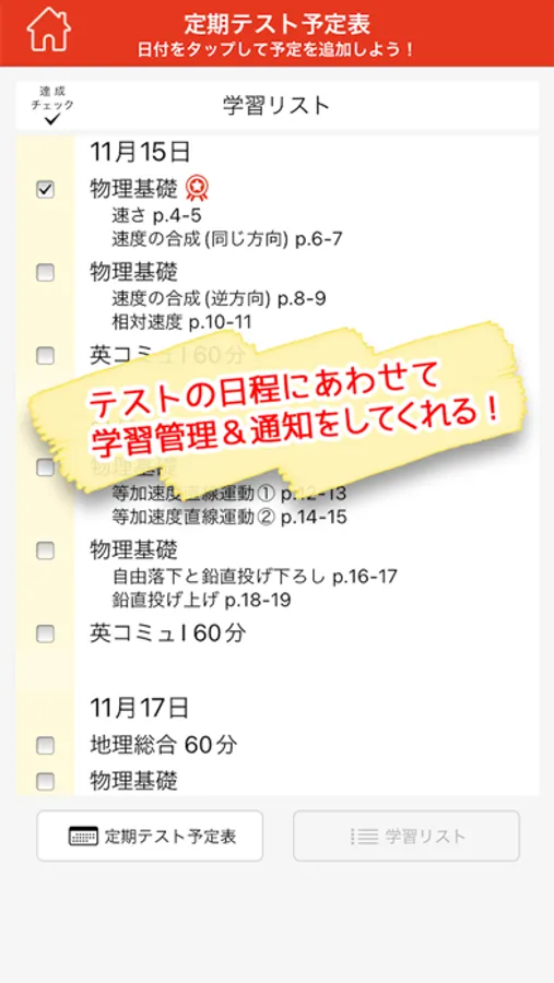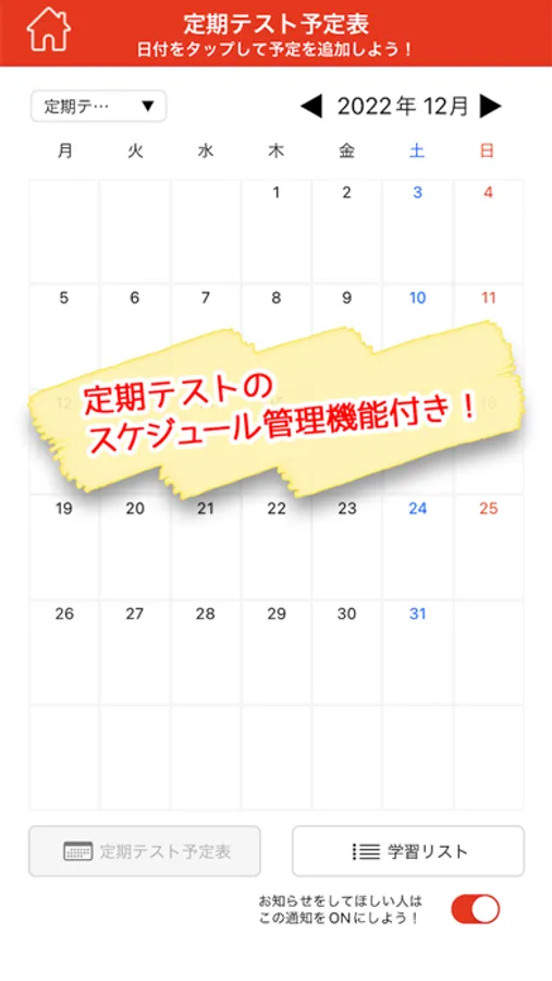 本アプリには,定期テストの学習計画を作成してくれるスケジュール管理機能が搭載されています。