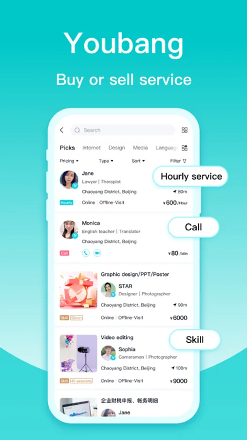 Youbang APP is a freelance services marketplace which opens up online employment opportunities for users and virtually matches needs with professional skills. Youbang has gathered professionals in various fields such as sports and fitness, art, design, video and music creation, animation, translation and writing, health, psychology, IT, business, finance and taxation, and legal consulting. Youbang is a one-stop social platform where all kinds of services are available.