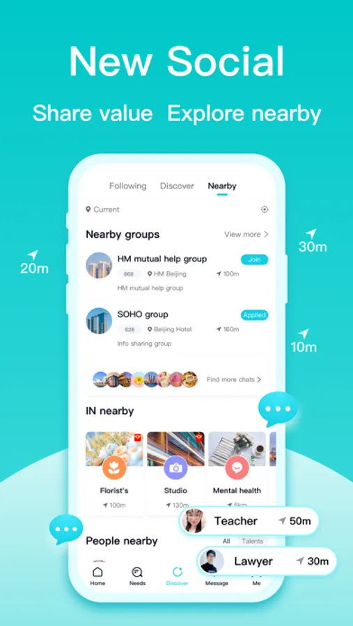 Open social networking in which you can find people/communities nearby. It is a new way of social networking based on skills, interests and hobbies.
