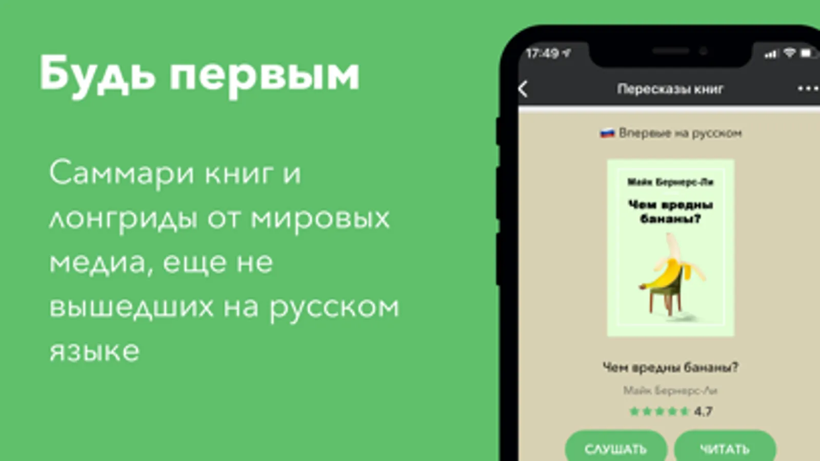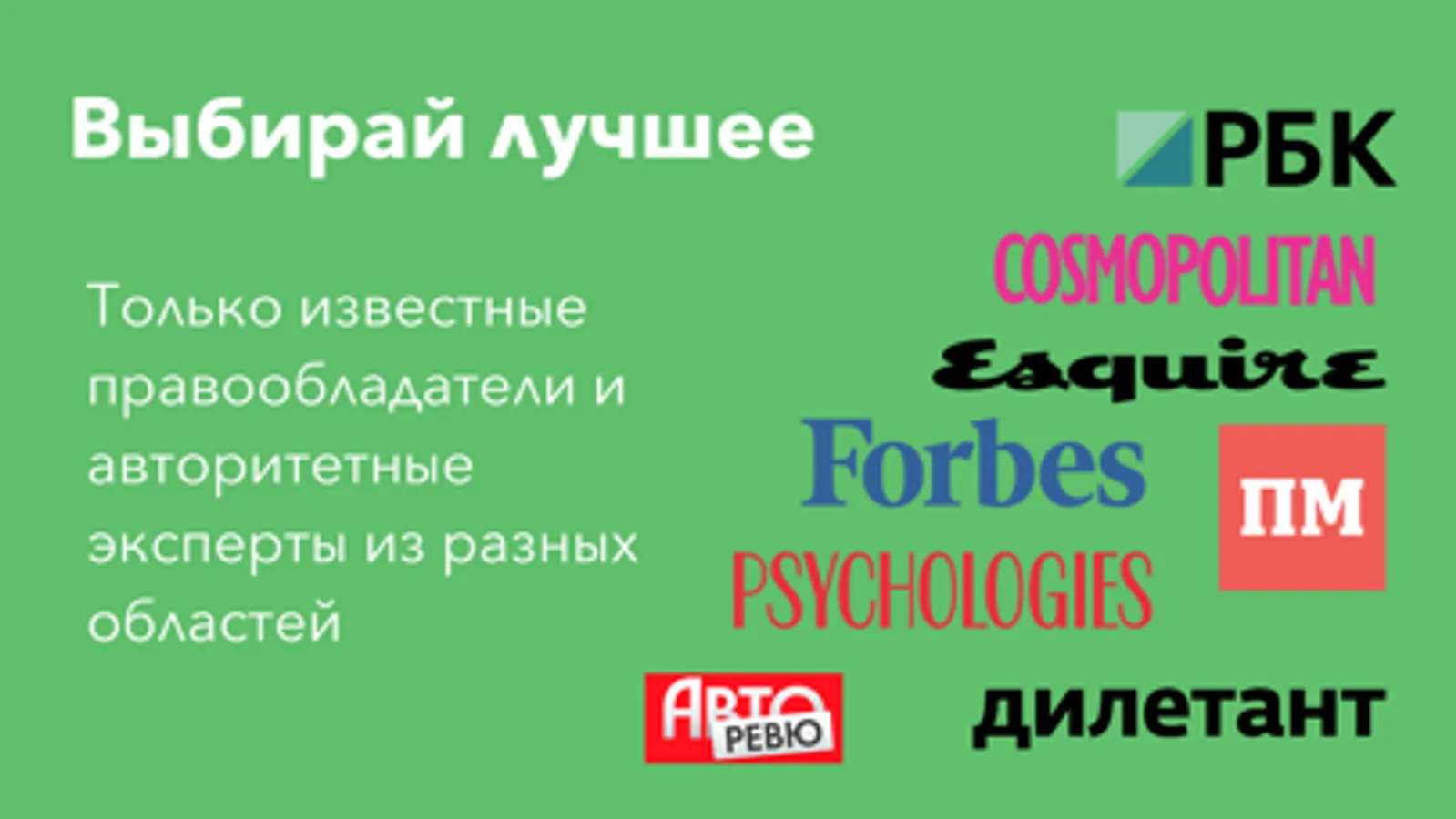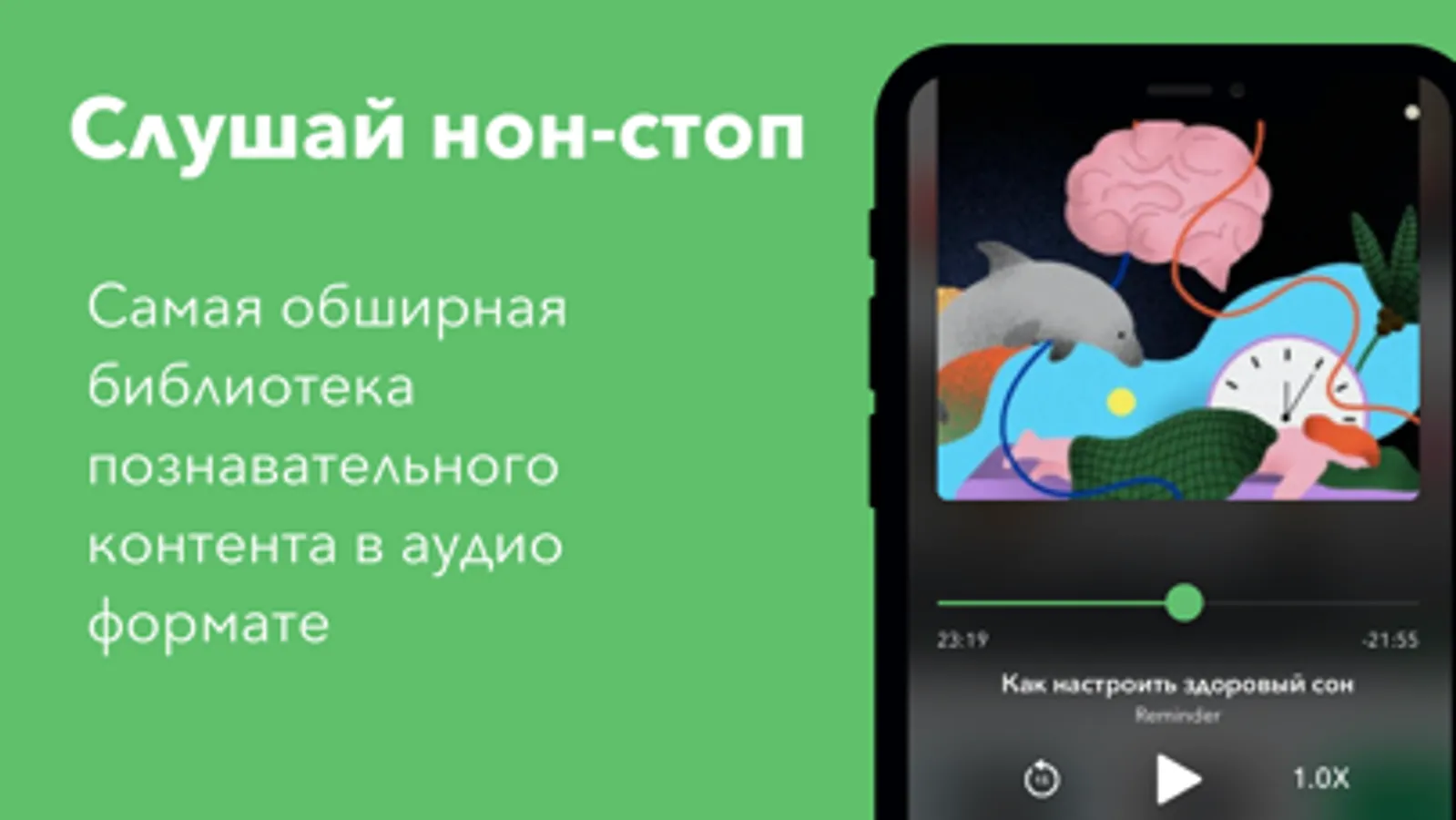 Read and listen to the best lectures and articles from more than 100 popular Russian media about Psychology, Popular Science, History, Culture, Art, Travel, Sport and Business.