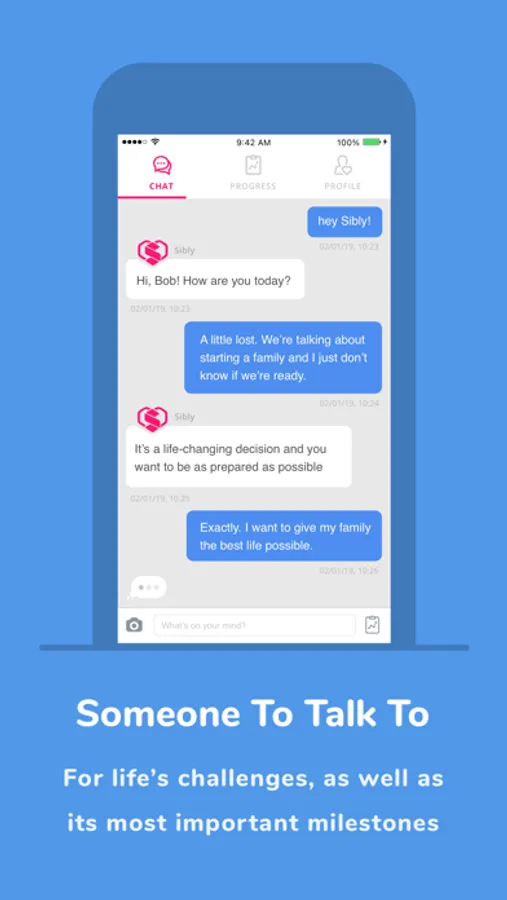 For Participating Organizations Only: We all need a little help sometimes. Sibly's helpful human coaches are available to chat with you live, 24/7. Whether you're facing a new challenge, dealing with life's ups and downs, or exploring a next step, Sibly helps you via private, confidential, and secure chat. Tap into coaches at your convenience through text so you can refer to conversations later or come back and pick up at another time. Sibly's trained coaches are your 24/7 support resource, here to listen and suggest tools to get you through whatever life sends your way.