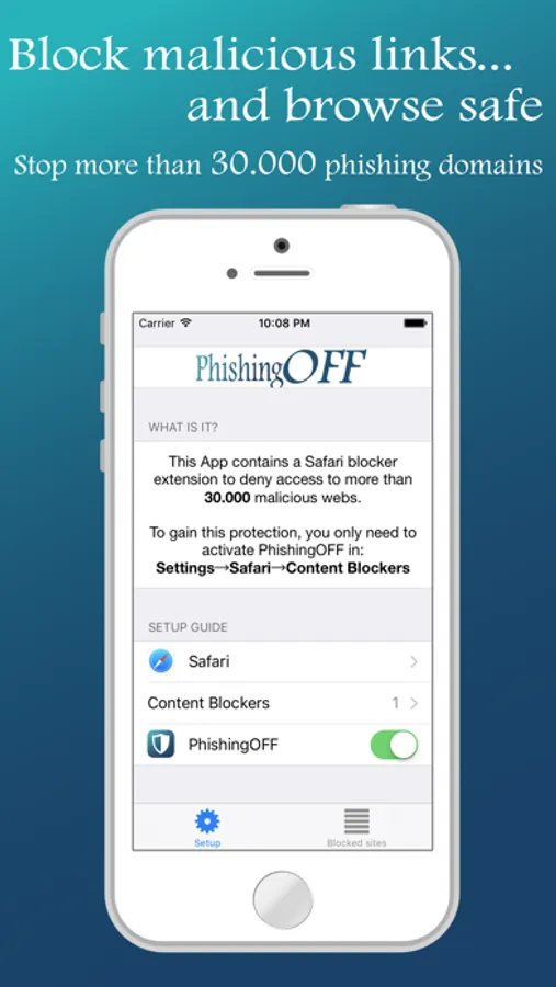 Stay safe blocking phishing web sites. This App helps you to block malicious phishing content when you are browsing in Safari. It's a Safari content blocker that blocks many phishing sites and malicious domains to prevent user data steal.