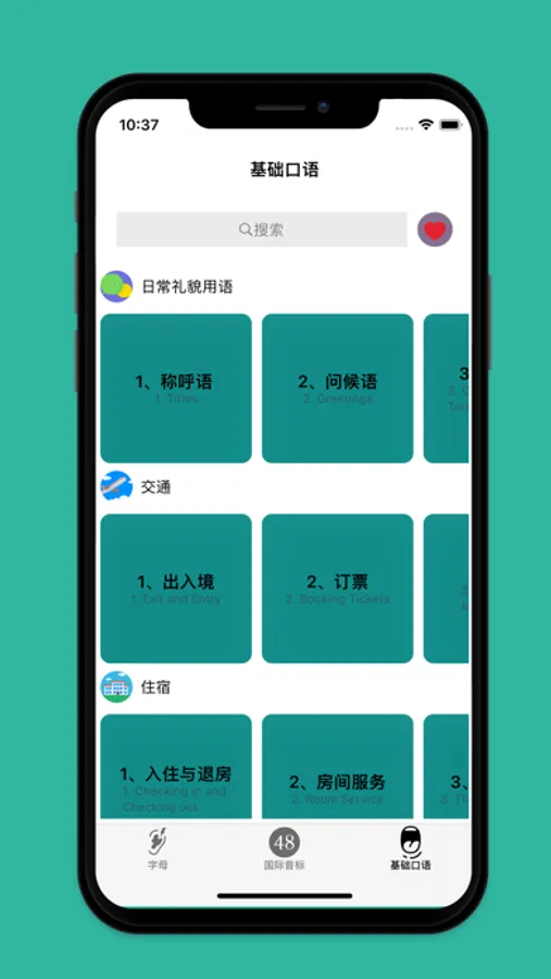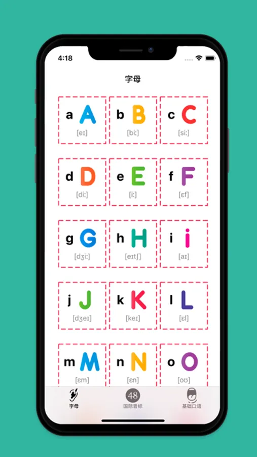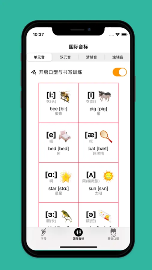 从基础的26个字母学习,48个国际音标教学,提供单词发音,并可使用练习板书写音标。
