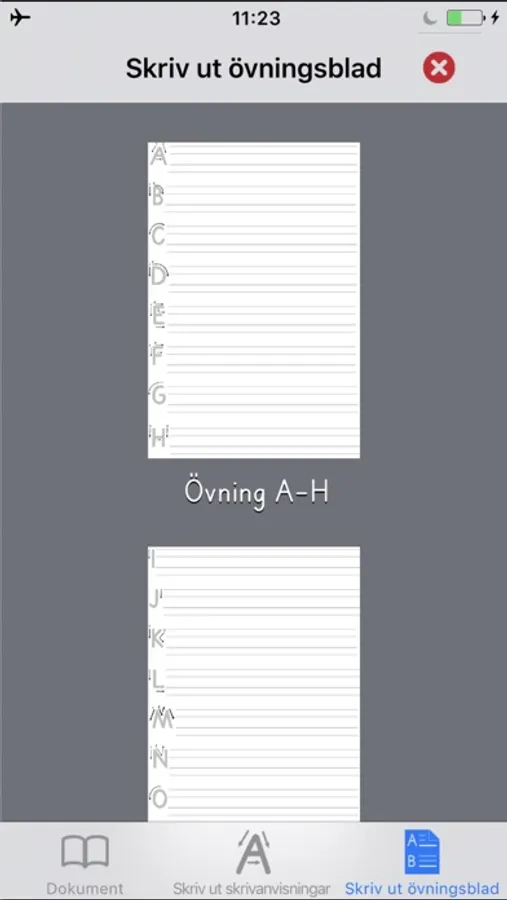Skriv ut färdiga övningsblad med hjälplinjer. Varje rad inleds med en bokstav med pilar som visar skrivriktning.