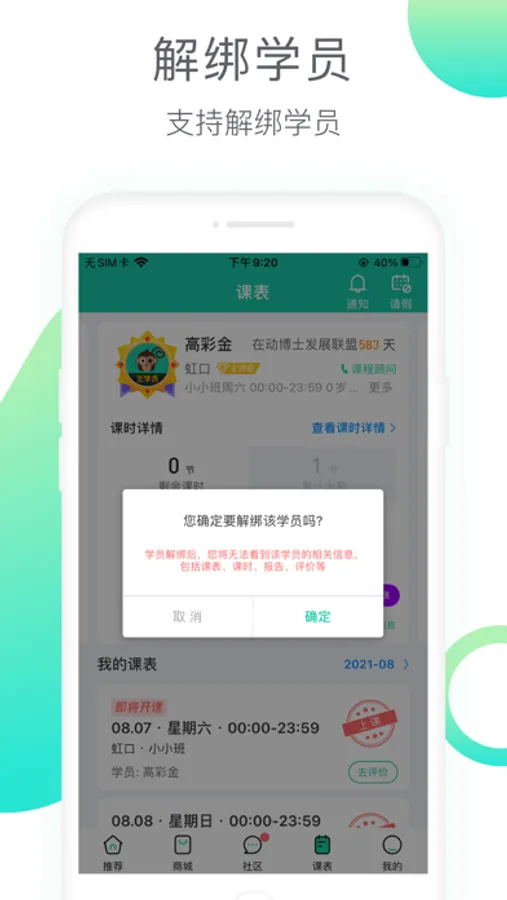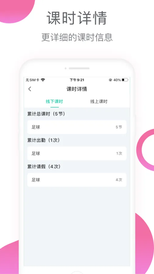 学员课程安排一目了然,课时统计清晰明了,在线掌握孩子的课程情况。