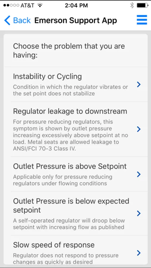 The Emerson Process Management Regulator Support App allows you to effectively troubleshoot your regulator, relief valve, or bulk storage products. Use this app to troubleshoot your product through a step-by-step guide, and automatically submit a troubleshooting ticket to your local sales representative. Sending a troubleshooting ticket allows you to take a video of your product, so your sales contact can correctly diagnose an issue.
