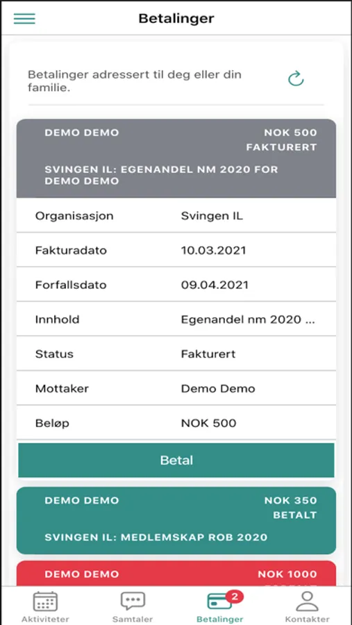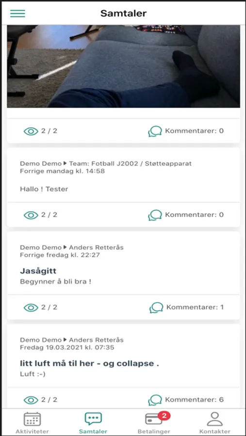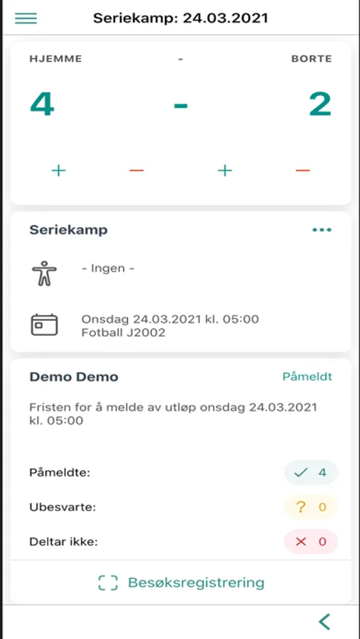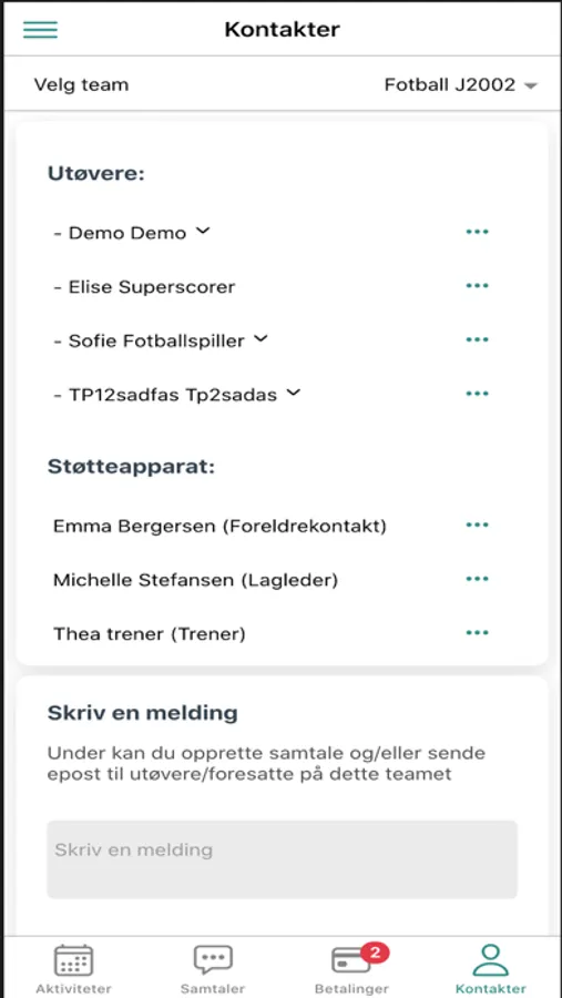 Inne i app'en får du også tilgjenglig kontakt-informasjon til alle registrerte foresatte på teamet slik at du kan ringe de eller sende en melding direkte fra telefonen din.