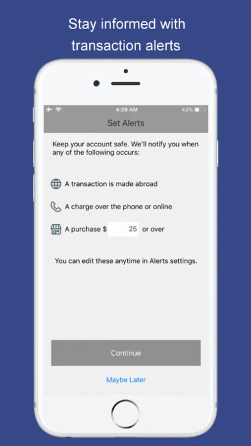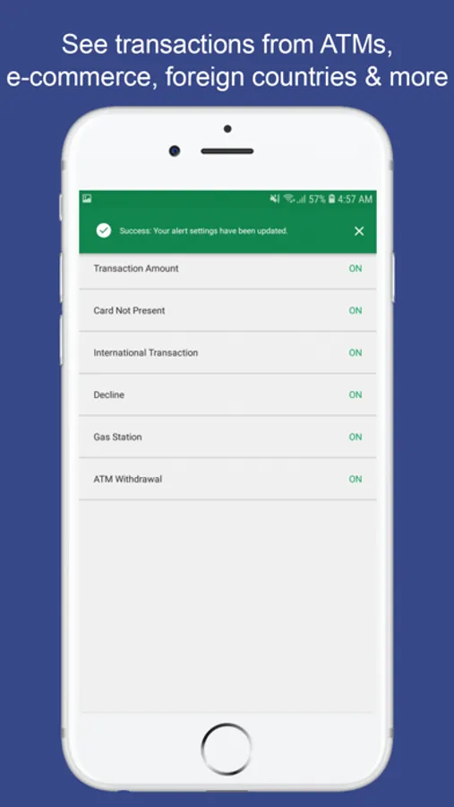 Once you have created a new username and secure passcode for logging on, and added your card(s), you'll have access to set alerts for: