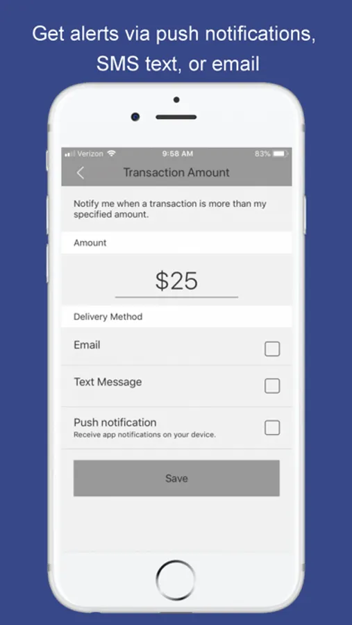 • Transaction Amount (you pre-set the $ amount of transaction to be alerted)