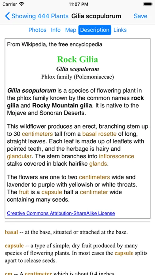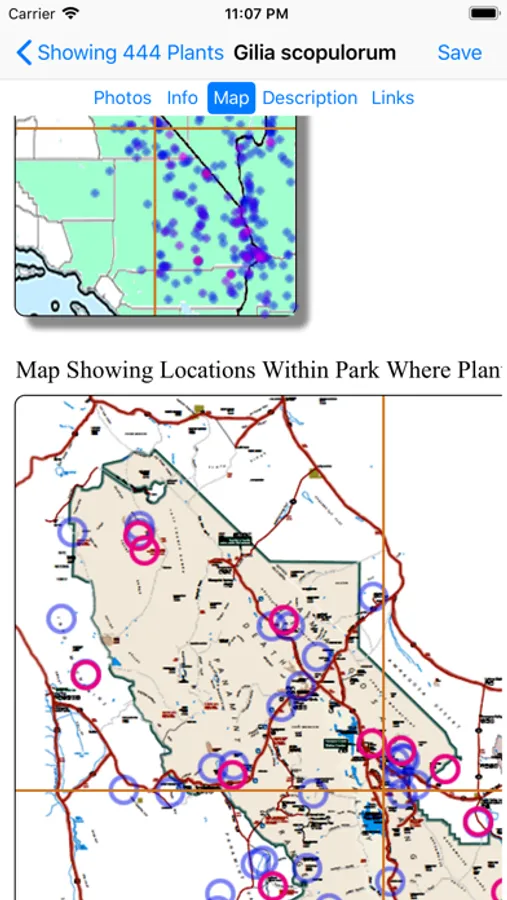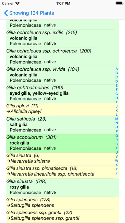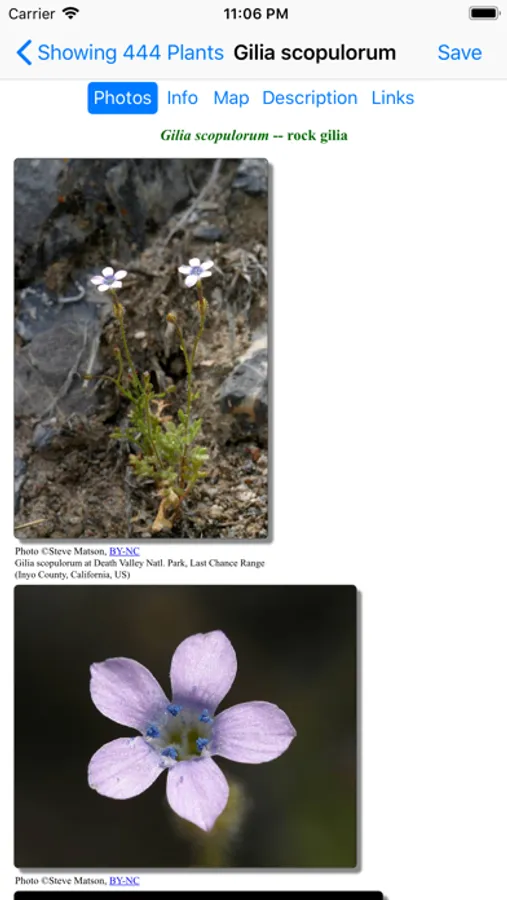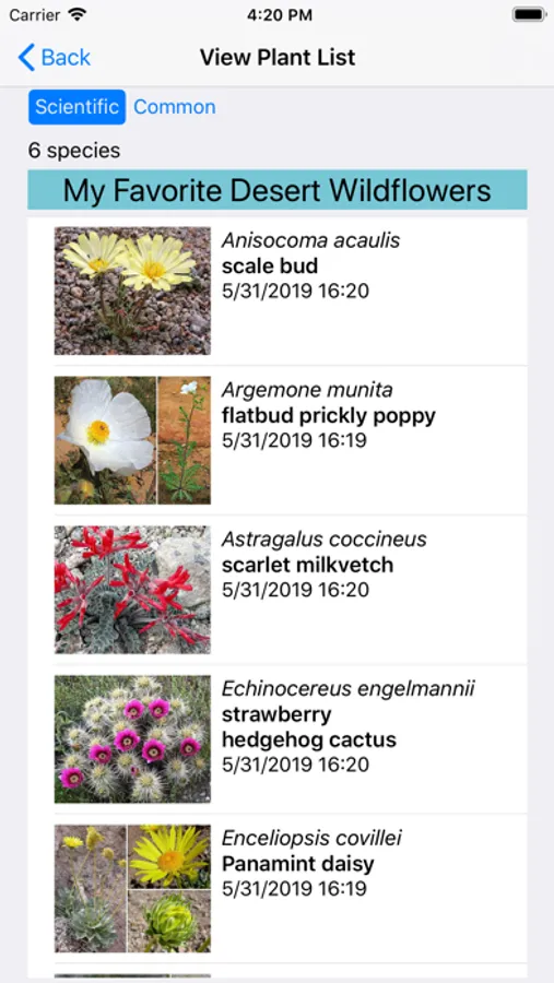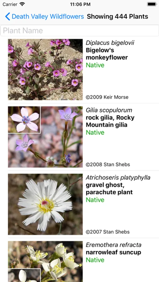 The App includes 1,678 species of plants found in Death Valley. Overall, 1,116 are "Wildflowers", 177 are shrubs, 44 are broadleaf trees, 16 are conifers, 8 are vines, 10 are cactus, 217 are grass-like, 26 are fern-like, 60 are moss-like, and 52 are lichen.