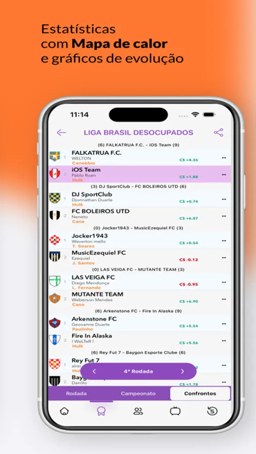 - Ao final de cada rodada é possível ver a variação de cada time em uma liga e filtrar por Campeonato, Turno, Mês, Rodada ou Patrimônio.