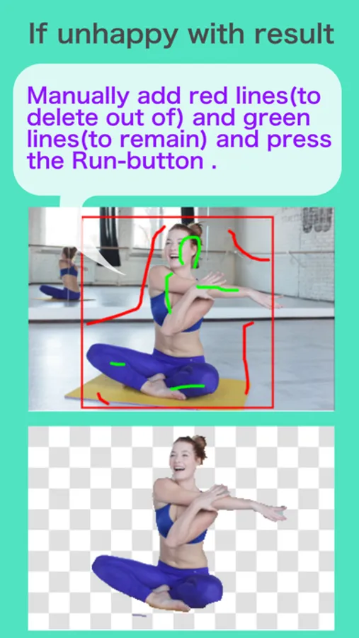 5 When in rectangle you draw red lines with finger , these areas are considered as removal . In reverse To remain-button enabled and green lines drawn , these areas are considered as keeping . Finally press Run-button . If unhappy , go back to the original and repeat same process .