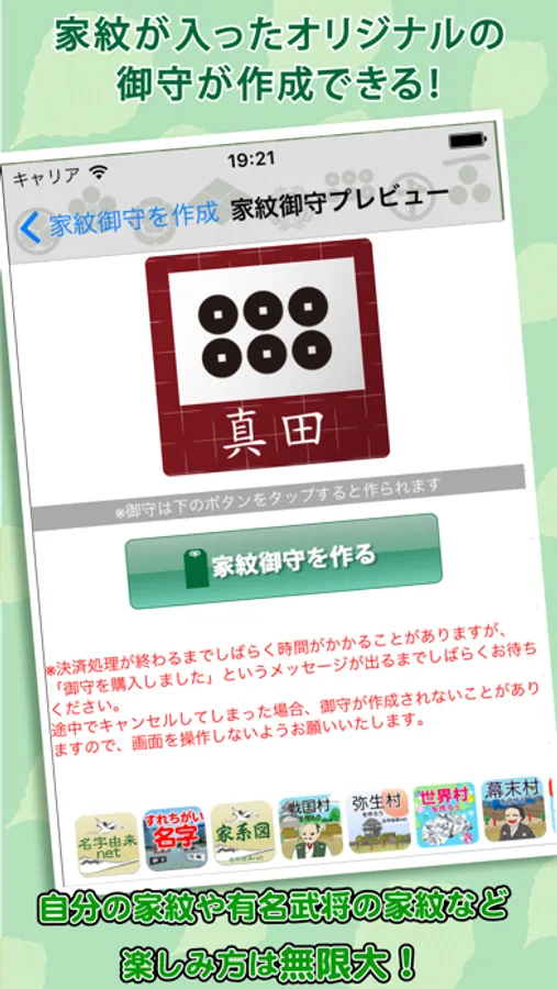 ・自分や好きな戦国武将などの家紋と名字、デザインを組み合せ、オリジナルの「家紋御守」を手に入れることができます。