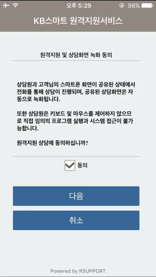 KB스마트원격지원은 iOS 기반의 모바일 단말기 화면을 전문상담원과 온라인으로 공유하여 단말기 문제를 원격으로 진단 및 해결할 수 있는 원격지원도구입니다.