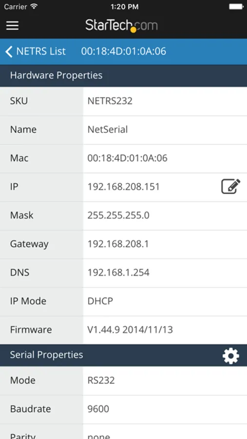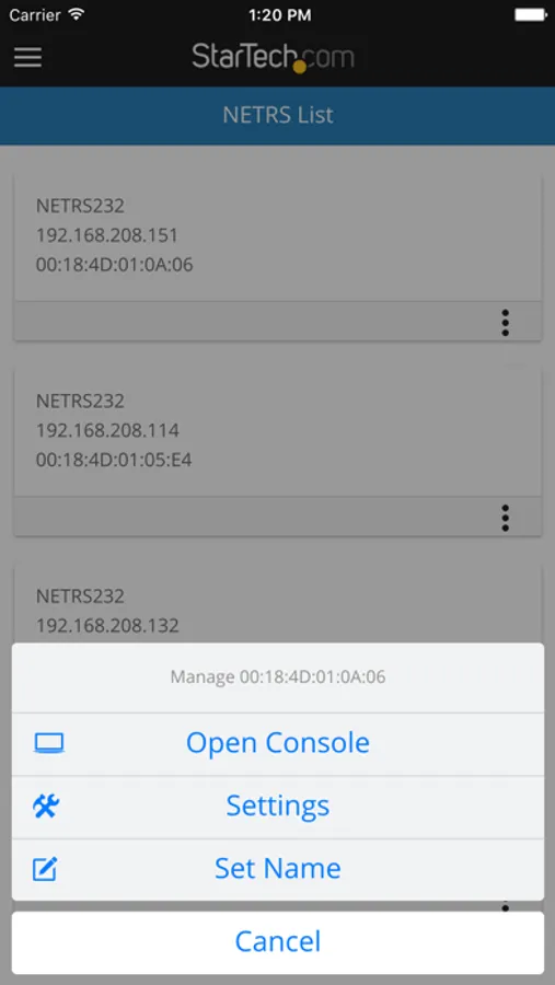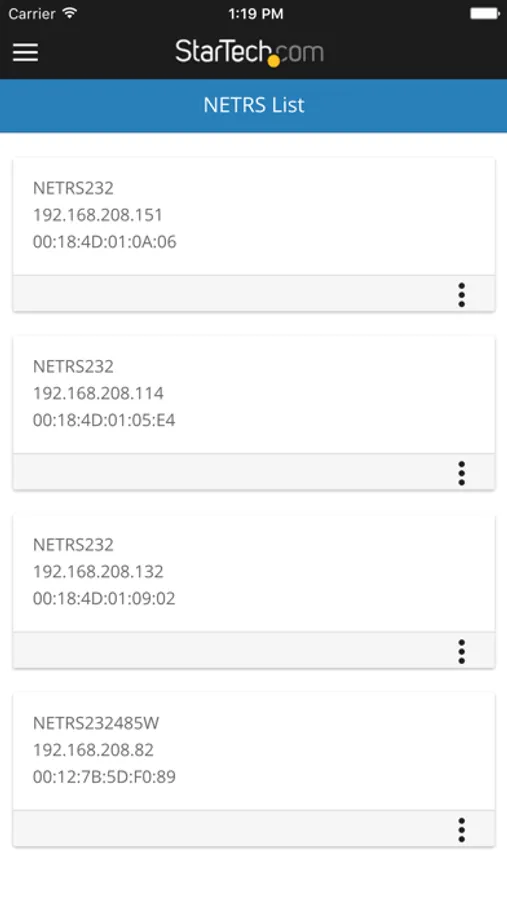 • The app automatically detects the StarTech.com serial devices that are connected to your network.