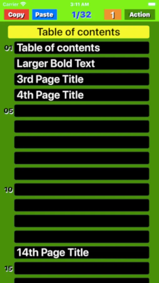 By tapping the "Copy" button on each page, the entered title and text will be stored in the device's memory. The text is also copied to the clipboard.