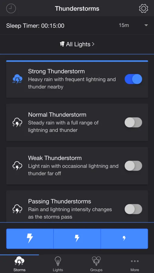 • Lightning on demand. Start a storm and tap one of the lightning buttons at the bottom of the page.