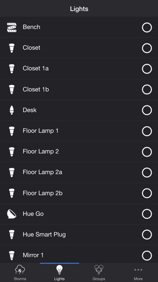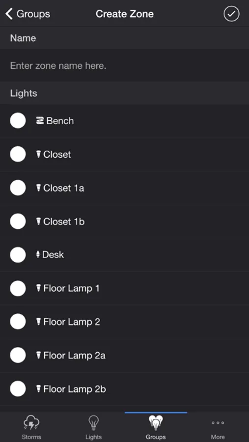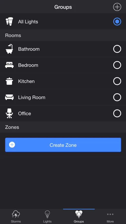 Select one or more lights for your thunderstorm light show on the Lights/Groups tab. Choose a group that you set up using the Philips Hue app, or create a new zone in the Thunderstorm for Hue app. To edit a zone in the list, swipe the item to the left and tap the pencil icon. When you add, remove, or change lights, pull down the list to refresh.