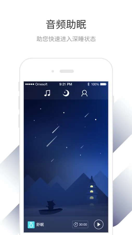 【睡眠宝】属于音乐治疗的范畴,由专注于BBT生物效应研究的MediSound实验室提供技术支持,其作用原理是通过独特的BBT技术(Binaural Beats Technology,双声拍技术)直接作用于大脑睡眠控制中心,促使脑波频率的转换,诱导用户缓解心理压力及促使身体放松以快速进入深睡状态。科学研究发现,30分钟的θ波状态可以减少多达4个小时的睡眠需求,相当于4个小时的正常睡眠。