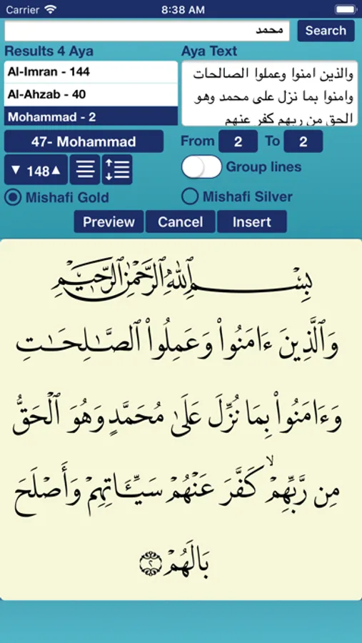 - NEW! Insert Quranic text using Mishafi Gold or Silver with search capability (full Quran available as In-App Purchase).