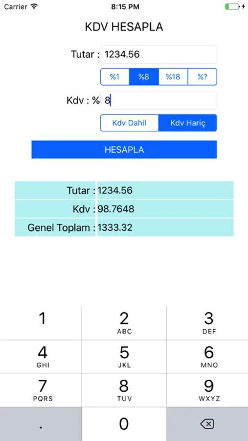 Kolay KDV hesaplama uygulaması. Tutarı girip Kdv yi Dahil veya Hariç olarak hesaplayabilirsiniz.