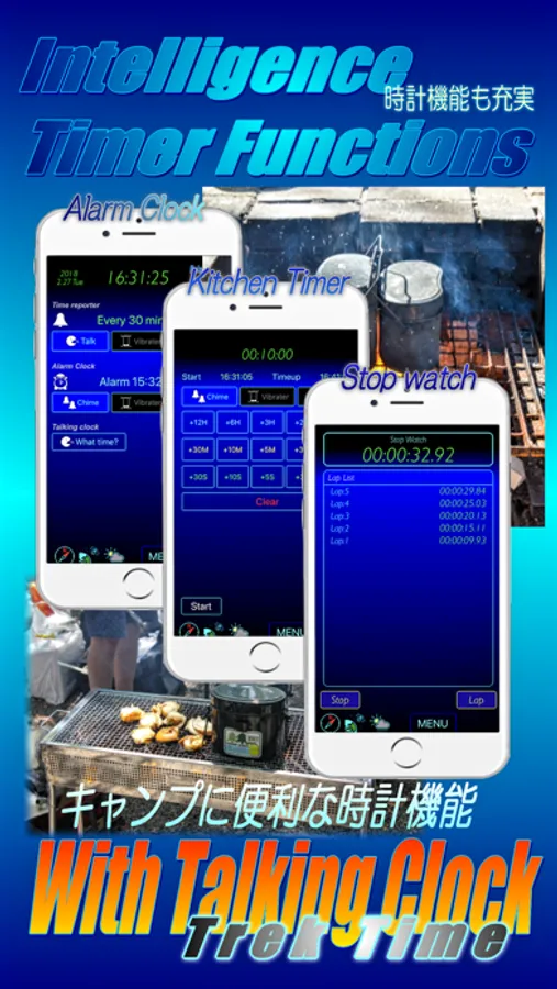3)時報、目覚まし、キッチンタイマーともに音、振動、LEDによる