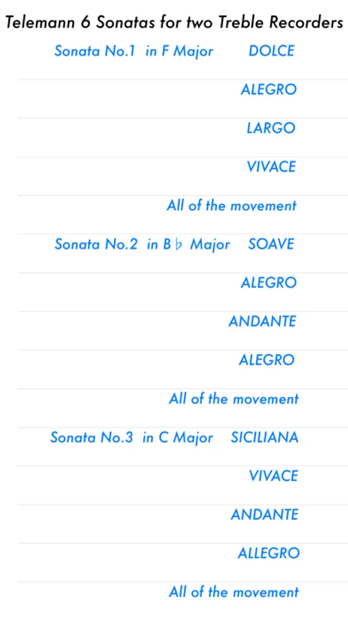 This App contain 1-3 of the Telemann 6 Sonatas for two Treble Recorders.Since it is independent of each part, by playing the other part, you can practice together.Pitch is 440 Hertz.