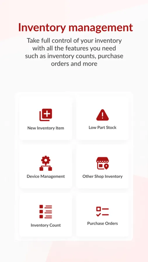 - Inventory Intelligence: Master your stock with inventory counts, purchase orders, and detailed inventory reports. Achieve greater control over devices under repair with our specialized device management features.
