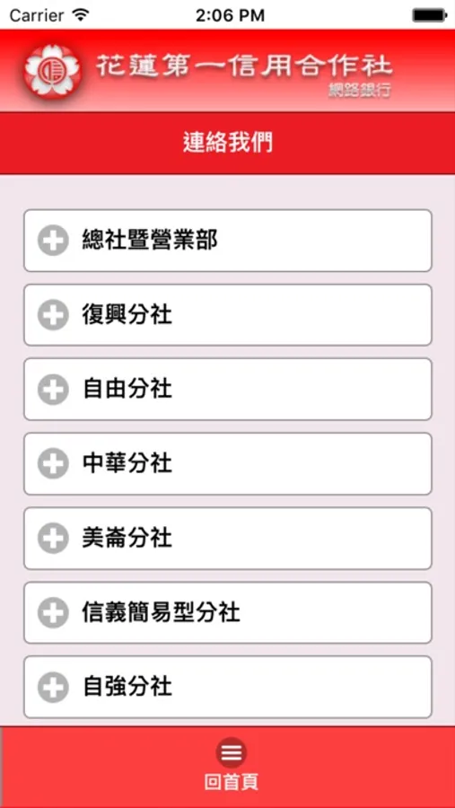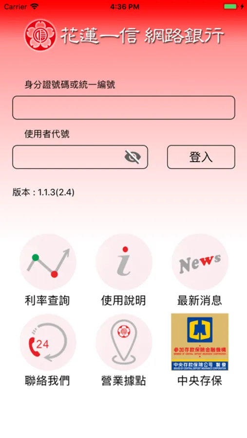 包含歸戶查詢、約定帳號轉帳、使用說明、最新消息、聯絡我們、利率查詢、營業據點查詢等功能。