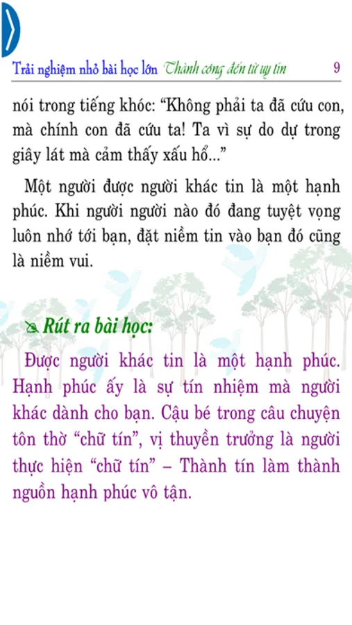 Bắt đầu từ hôm nay, bạn hãy dành một chút thời gian để đọc và suy ngẫm những “Trải nghiệm nhỏ bài học lớn 9 (Small experience, big lesson) – Thành công đến từ uy tín”. Rồi bạn sẽ nhận được những bài học quý giá, những kinh nghiệm, những kỹ năng bổ ích làm hành trang bước vào cuộc sống. Bạn sẽ khám phá được nhiều điều kỳ diệu từ cuộc sống và nhận ra rằng bản thân mình ngày càng trưởng thành và tự tin hơn.