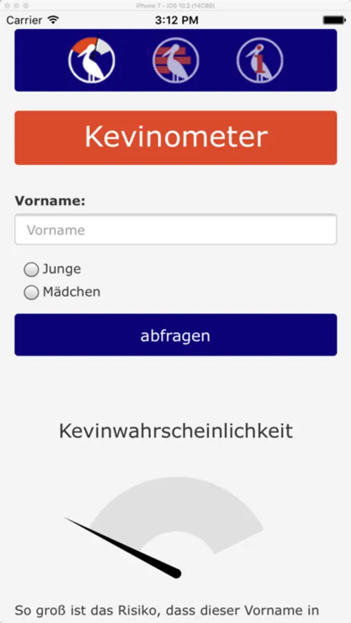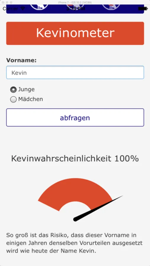 Das Kevinometer ist für über 70.000 Vornamen einsetzbar, kinderleicht zu bedienen, frei von Werbung und kann ohne Online-Verbindung genutzt werden. Du gibts Namen und Geschlecht ein – und erhältst nur Sekunden später die „Kevinwahrscheinlichkeit“ als Prozentwert. Bleibt der Zeiger im grünen Bereich oder wandert er ins rote Feld? Probiere es aus! Erdacht und entwickelt wurde das Kevinometer von dem Vornamens-Experten Knud Bielefeld, Betreiber von beliebte-Vornamen.de, der alljährlich Deutschlands beliebteste Vornamen ermittelt.