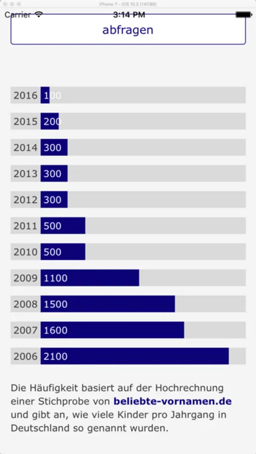 2018 wurden in Deutschland 3.400 Kinder Oskar genannt, 2006 waren es nur 600. Ganz anders die Beliebtheit von Kevin: Es gibt 2.100 Kevins des Jahrgangs 2006 und nur 100 aus dem Jahr 2018. Finde heraus, wie häufig ein Name vergeben wurde! Anhand einer repräsentativen Stichprobe ermittelt die App Kevinometer für mehr als 4.000 Vornamen, wie viele Namensträger es pro Geburtsjahrgang gibt. Auswertungsgrundlage: fast zwei Millionen Datensätze von 2006 bis 2018.
