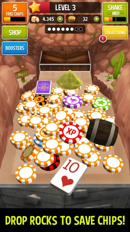 Did you ever play this favorite arcade game at a carnival, state fair or casino? This exciting coin dozer app is filled with big chip prizes and coin specials. Drop the chips in the right place and earn more chips and prizes like card decks, dices and tons.