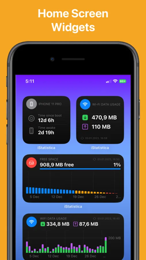 iStatistica is a system and activity monitor for iOS. It includes a Monitoring Dashboard, Lock Screen and Home Screen widgets. Take a quick overview of realtime information about RAM usage, uptime and key network details. Network statistics includes external, gateway and local IPs, speed and data rates chart.