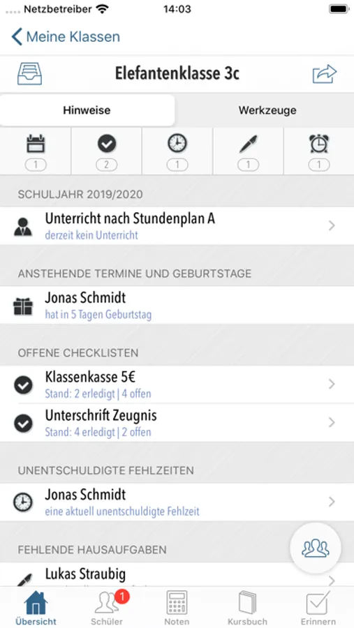 Die Klassenmappe erinnert Sie u.a. an bevorstehende Geburtstage Ihrer Schüler, an Erinnerungen, fehlende Hausaufgaben, unentschuldigte Fehlzeiten und hilft Ihnen bei der Verwaltung von Checklisten (z.B. Einsammeln von Theatergeld, Referaten, etc.), Schülernotizen, Notenschlüssel und Ihrer Unterrichtsplanung. Die Klassenmappe unterstützt verschiedene Notensysteme, Halbjahresnoten und die Eingabe als Tendenz- oder Dezimalnote.