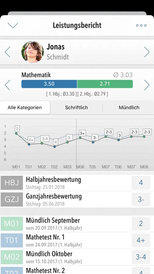 - Tendenznoten (z.B. 2-), Dezimalnoten (z.B. 2.3), ganze Noten (z.B. 15-0) sowie Prozentwerte (z.B. 53%)