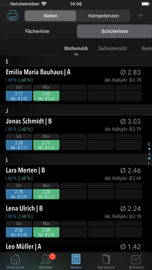 Verwalten Sie in der Klassenmappe Ihre Schülerdaten, Fächer, Bewertungen, Kompetenzen, Hausaufgaben, Fehlzeiten, Materialien, Mitarbeit, Stundenpläne, Unterrichtsplanung, Schülernotizen und Sitzpläne (und mehr...). Das Programm ist darauf hin optimiert, dass Sie Ihre Eingaben zügig in der Unterrichtsstunde anlegen und überblicken können. Lassen Sie sich Ihre Einträge in Listenform darstellen, als PDF Dokument exportieren oder in die Desktop Klassenmappe für Windows oder MacOS übertragen. Natürlich funktioniert die App auch vollständig ohne Desktop-Anbindung!