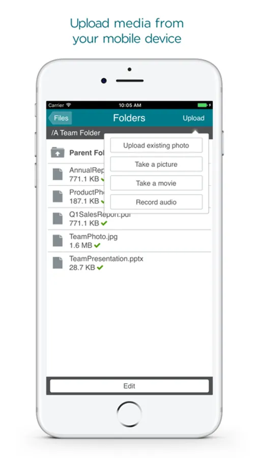 Upload files from your camera roll; or record live video, audio, or photos directly from your device's camera. Access any file types and open them with other applications on your mobile device. Forward file packages to others through the app, without the need to download the file to your mobile device. Request and review delivery receipts and know when recipients have read the message.