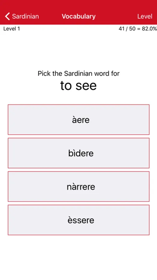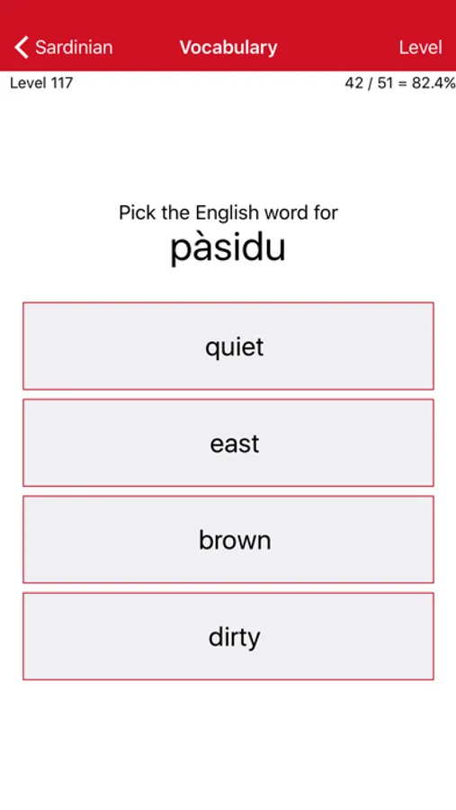 • Vocabulary: 200 levels, each testing your ability to match ten Sardinian words with their English equivalents. Interspersed among these are cumulative levels reviewing what has been learned earlier (giving a total of 226 levels).