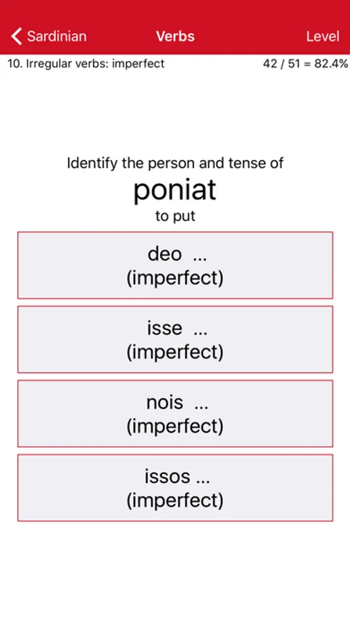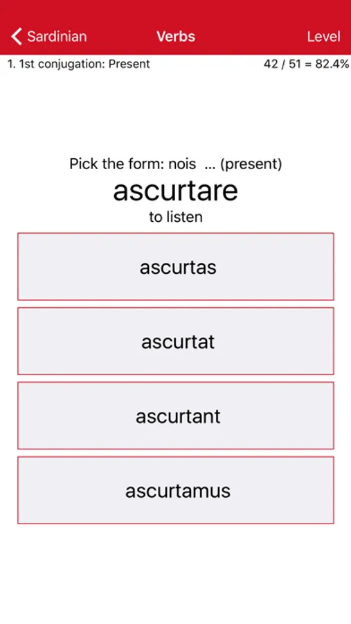 Wherever you have your phone and a free moment, it offers a continuous multiple-choice test on Sardinian vocabulary and the conjugation of Sardinian verbs. Each answer you give is immediately confirmed or corrected, and your knowledge is reinforced by repetition.